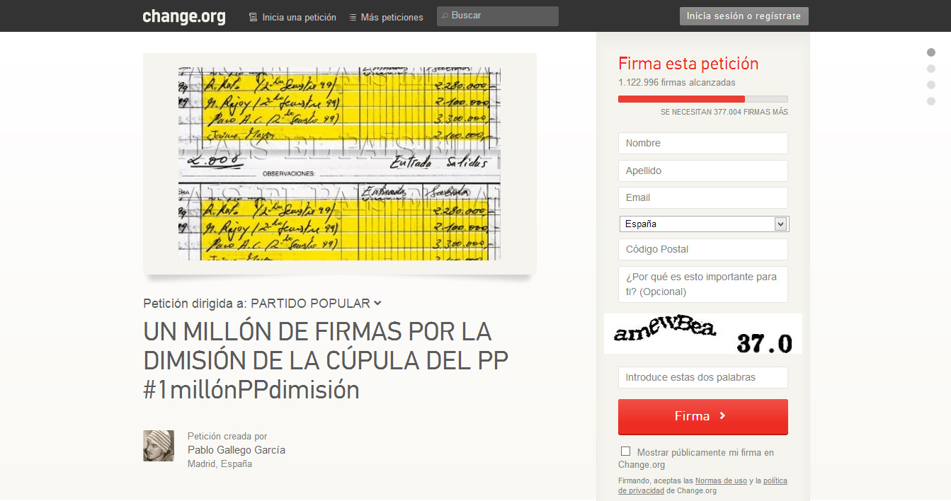 Para saber cómo se gestó la idea de Pablo García Gallego hay que trasladarse al pasado 31 de enero, cuando a través de chance.org comenzó la iniciativa de este madrileño, creador del blog Manifiesto Juventud, para recoger 1 millón de firmas a favor de la dimisión de la cúpula del Partido Popular tras el escándalo del conocido como ‘Caso Bárcenas’. La propuesta contó con el rápido apoyo de los internautas y en tan sólo una semana, el reto estaba conseguido. La cifra del millón fue superada ampliamente, por lo que la iniciativa, que aún sigue activa en la red, busca ahora llegar a 1,5 millones de apoyos.