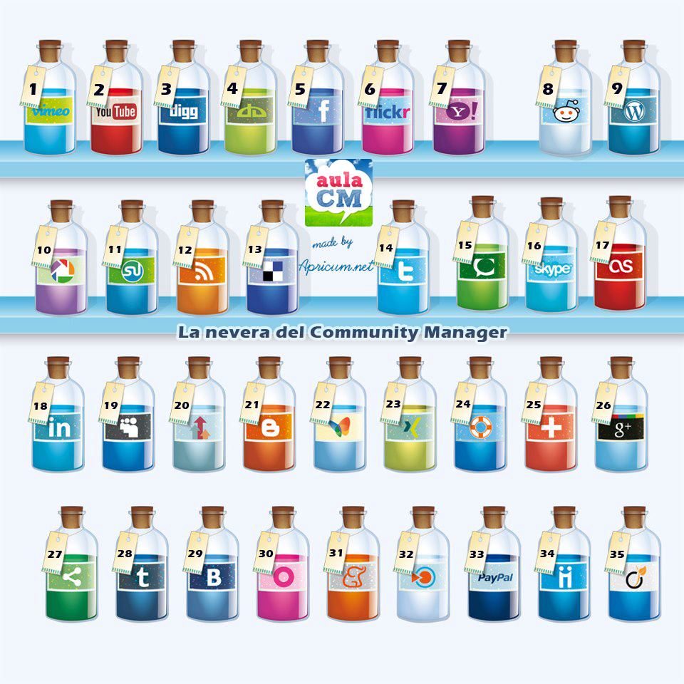 • En la #clase2 la práctica la puso la Nevera del Community Manager. Se trataba de identificar 35 logotipos con la herramienta o la red social a la que pertenecían. En este caso, para participar había que tuitear a través de nuestra cuenta, mencionando la de @aulacm, y publicando la relación de los números de cada dibujo junto al nombre de la marca a la que representaban (ver imagen superior).